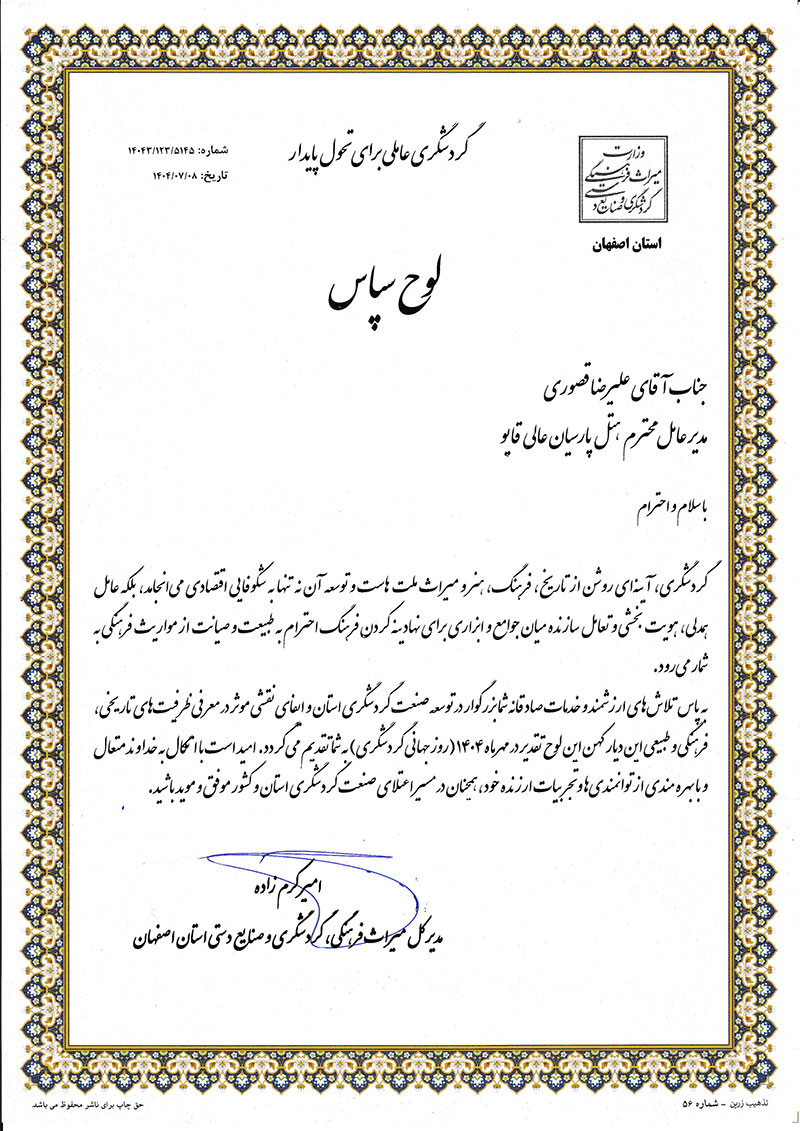 علیرضا قصوری، مدیرعامل محترم هتل پارسیان عالی‌قاپو، در این مراسم ضمن خوش آمدگویی و تبریک ولادت امام حسن عسگری (ع) و هفته گردشگری به مدعوین، اهداف این اقدام را چنین تشریح کرد: